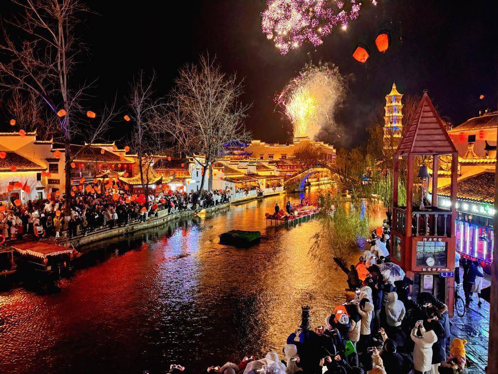 除夜夜,走进安徽省铜陵市义安区犁桥水镇,只见烟花漫天、灯火灿艳,身着汉服的搭客溜达街巷。